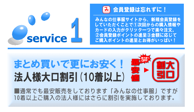| ◆お見積もりについて みんなの仕事服ワーカー店では、業界最安店を目指しております。 複数購入の場合はさらに値引きさせていただきます。 他店の見積もり書のお持ち込みも歓迎致します。 万が一当店よりお安いショップがあればお申し付けください。 |