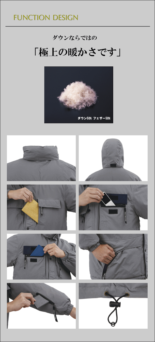 | ■素材 | [表]ナイロン100%[裏]ナイロン100%[中綿]ダウン50% フェザー50% | |